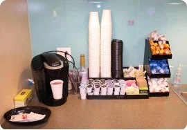 A self-serve station with coffee, tea, and water.